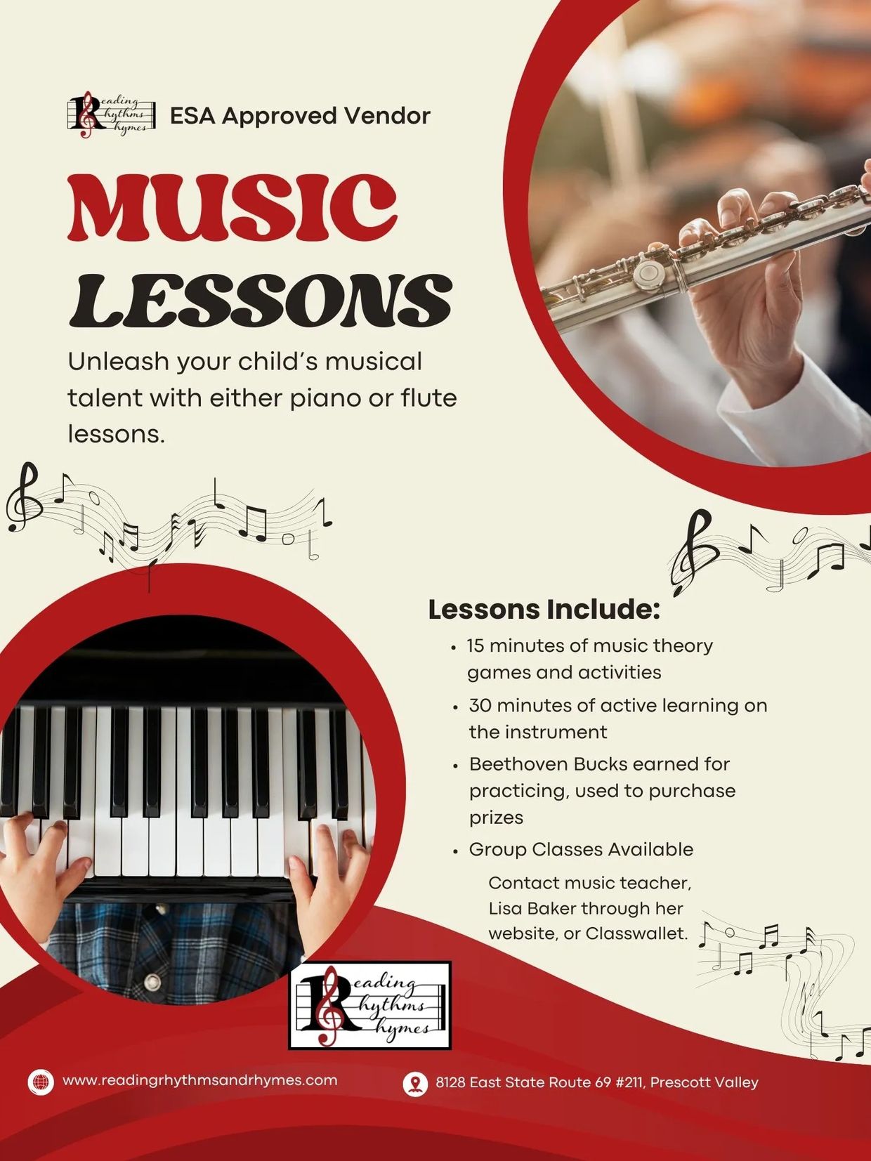 Not only is Lisa Baker a children's author, but she also provides quality music education for children in the Prescott Valley, AZ, area. Students can learn to play piano or flute, in private or group settings. Lisa incorporates music theory games and activities in addition to time on the instrument. For an added level of encouragement to practice, students can earn "Beethoven Bucks" to purchase items from the "store." Help stimulate both hemisphere's of your child's brain with music.